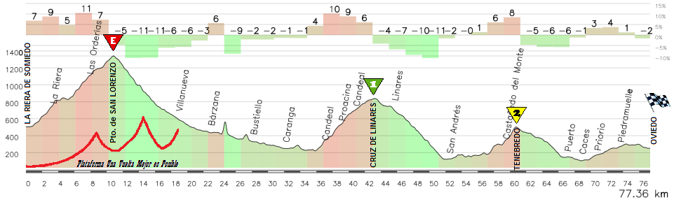 Tras la vertiginosa bajada del San Lorenzo, unos 14km de falso llano descendente nos llevan a Proaza, donde comienza la subida al puerto que debería ser el protagonista de esta etapa, la Cruz de Linares que ya hemos presentado.