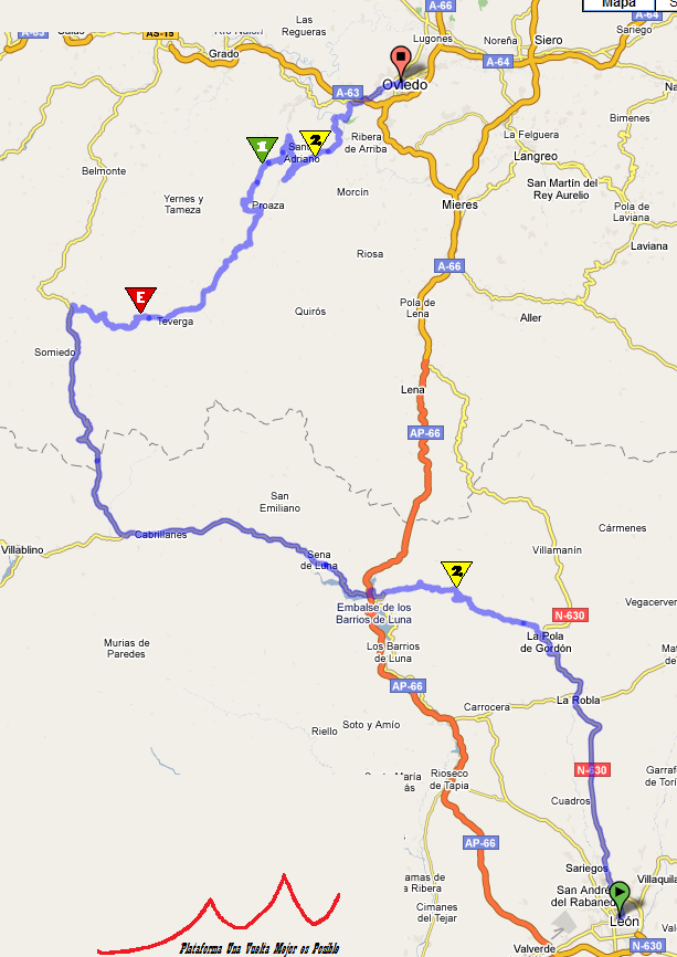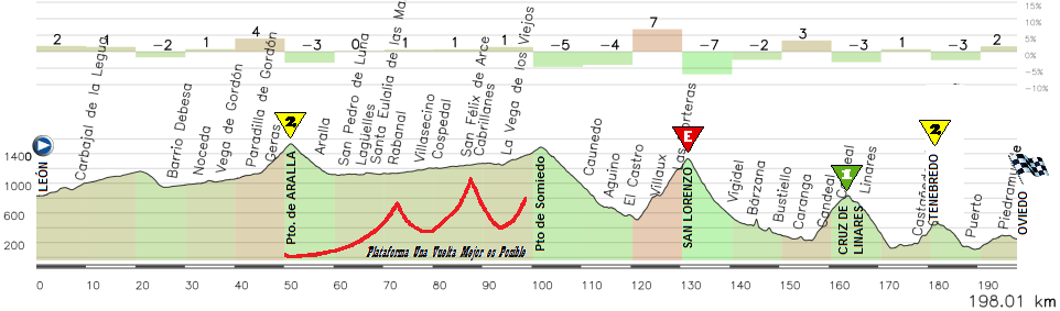 En este caso la etapa incluye el Puerto de Aralla, de 2ª, antes de acceder a Asturias a través del Puerto de Somiedo. Tras su vertiginosa bajada comienza la fase definitiva de la etapa, con el Puerto de San Lorenzo. Este es uno de los puertos de paso de categoría Especial de la Península, y lo es debido a sus temibles rampas pues solo son 10km de ascensión. Este puerto ya es conocido, pues se ascendió en la Vuelta 2006, en la etapa entre Fonsagrada y La Cobertoria.