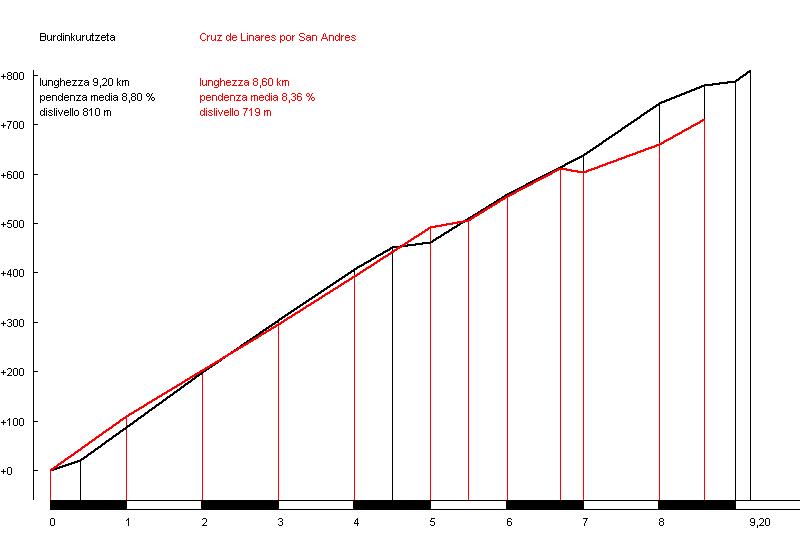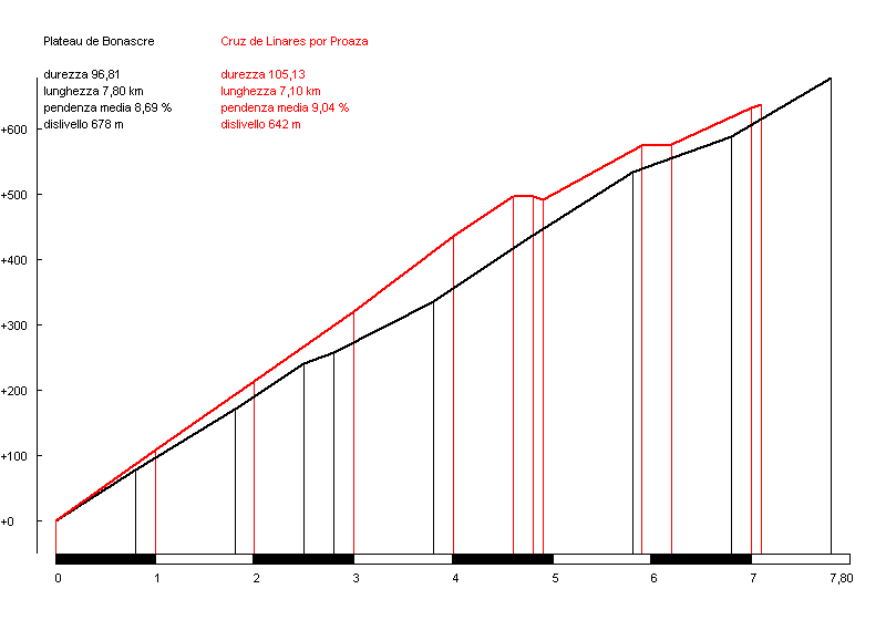 Como referencia de la dureza del puerto tomaremos la subida a Plateau de Bonascre, varias veces final de etapa en el Tour, para compararla con la vertiente sur de Proaza. Gana el puerto asturiano al francés por una ligera diferencia. La vertiente norte de San Andrés se puede comparar con Burdinkirutzeta, aunque este tenga los dos últimos km más duros.