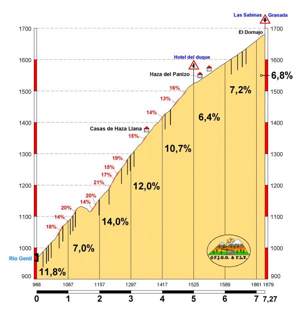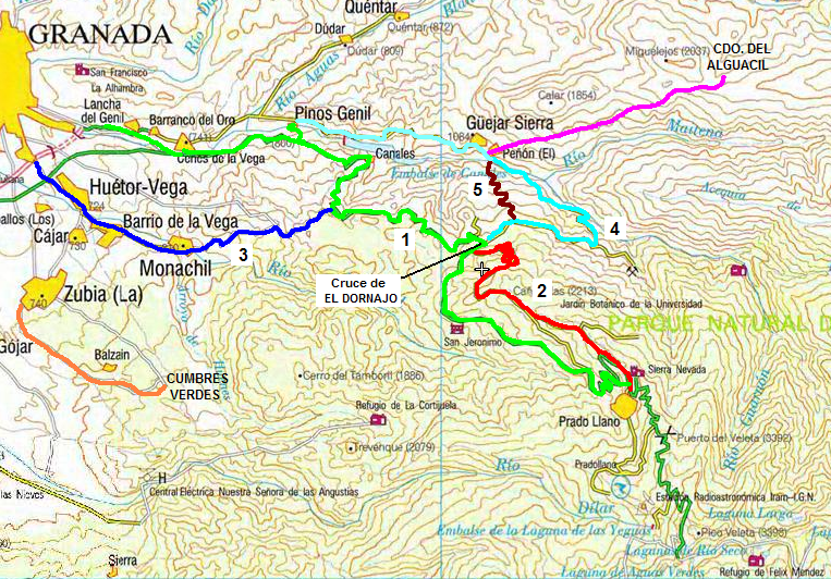 • 5.- Marrón: carretera de Hazas Llanas: actualmente en obras para su asfaltado (ya completamente asfaltada), que será una carretera amplia pero brutal. Aquí se puede ver la noticia de su asfaltado, que lo convertirá en una carretera perfecta y amplia, y esta es su altigrafía desde Guejar Sierra hasta el cruce de El Dornajo, a la que habría que añadir el tramo anterior desde Pinos Genil y el posterior desde el Dornajo (ver imagen anterior). Ver perfil de la subida completa.