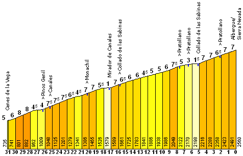 • 3.- Azul oscuro: carretera de Monachil: ya conocida, endurece mucho el inicio de la subida haciendo que el final se haga eterno. En 2009, la subida a Sierra Nevada se realizará por Monachil enlazando luego con el Collado de las Sabinas, es decir, la opción mas dura a día de hoy. Este es su perfil.