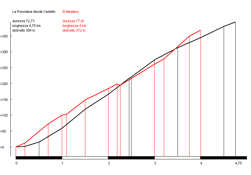Este pequeño muro aparece como una nueva variante para terminar la clásica etapa de Ávila, que siempre depara espectáculo aunque de cara a la general en ocasiones no resulte trascendente. Con la inclusión de este puerto, muy posiblemente la expectación aumente, y las consecuencias de cara a la general puedan ser mayores. Hemos elegido un puerto clásico de la Península Ibérica como es el Alto de Cerler (hasta la población de ese nombre) para la comparativa, así como la parte final del Alto de la Presolana, donde Alberto Contador estuvo a punto de ceder la ‘Maglia’ Rosa en el Giro de 2008.