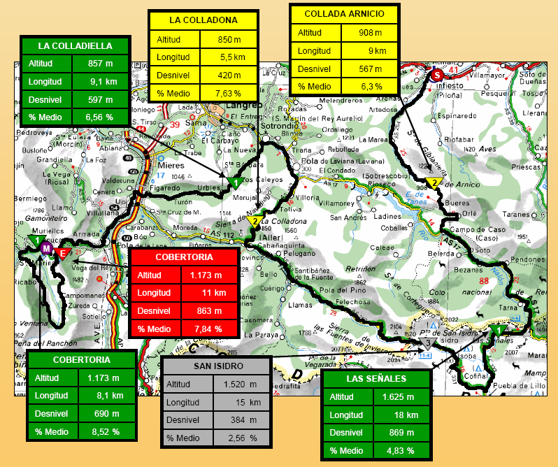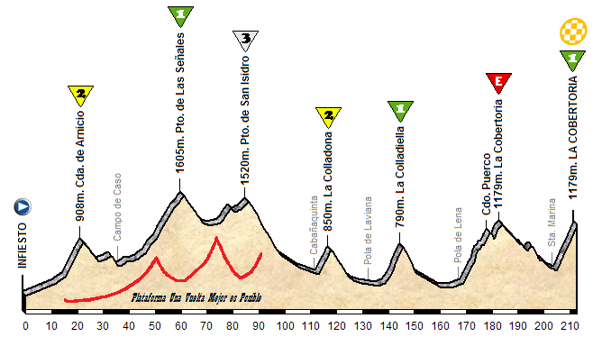 Esta otra etapa asturiana recorre los valles centrales del Principado, especialmente el del Caudal, mostrándonos los encantos y la dureza propias de las montañas de esta comunidad, con más de 5000m. de desnivel total acumulado. El comienzo de la etapa supone el paso por el conocido puerto de Arnicio, lugar idóneo para que los más aventureros decidan probarlo. El primer escollo serio será el paso por el puerto de Las Señales, de gran longitud pero sin grandes rampas, que se corona a más de 1600 metros de altitud. De ahí se volverá a Asturias por el puerto de San Isidro, de 3ª categoría, cuyo descenso nos deja al pie de la Colladona, un segunda que precede al primer puerto con rampas duras de la jornada, la Colladiella, paso de montaña utilizado habitualmente en los últimos años por La Vuelta y que esconde en sus kilómetros rampas muy fuertes. El descenso precede al llano y este nos deja en la localidad de Pola de Lena. Allí comienza la ascensión al inédito monstruo de la jornada: La Cobertoria por el Cdo. Puerco. Si inédita es la subida, inédita también lo es la bajada por la vertiente sudoeste. Esta carretera nos dejara frente a los últimos ocho kilómetros de etapa, en los que se asciende de nuevo La Cobertoria por la misma vertiente que fue final de etapa en 2006. Alta montaña por el centro asturiano, con una pequeña incursión por la montaña leonesa, con un kilometraje elevado pero no excesivo y un tercio final de etapa muy duro.