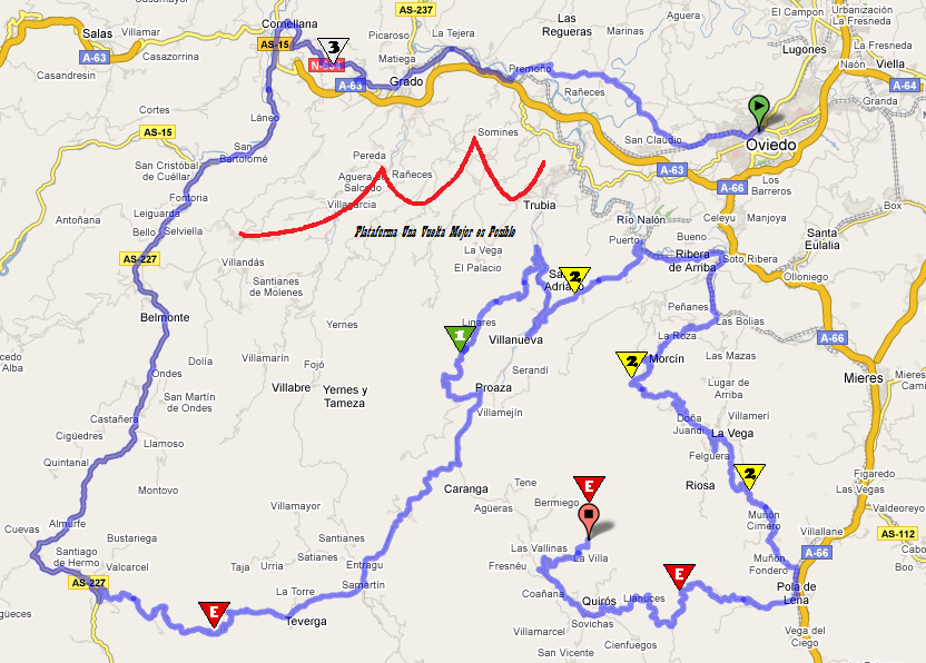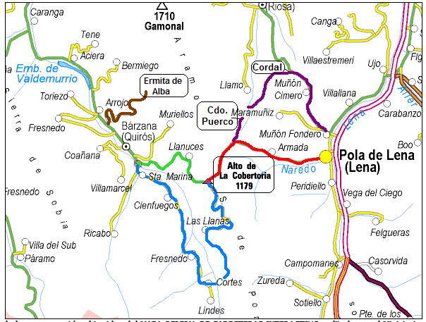 - 1.- ROJO: Desde Pola de Lena, la vertiente más dura por su continuidad, y que tras casi 10 años de obras ya solo quedan los últimos retoques para que se terminen definitivamente. Esto también afecta a la altimetría, puesto que se ha recortado sensiblemente el trazado y por tanto ha aumentado la pendiente, haciéndolo perfectamente comparable al Passo Giau desde Selva di Cadore.