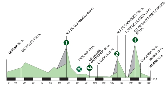 Primera etapa en línea y con un recorrido de media montaña. Se pasarán los altos de Els Angels (unos 11 km al 3,5% de media pero muy irregulares), Cadaqués y Sant Pere de Rodes. La cima de este último está a 17 km de meta. Lo más probable es que las rampas de Sant Pere de Rodes rompan el pelotón (si aún sigue compacto), y la victoria se dispute al sprint en un grupo reducido.