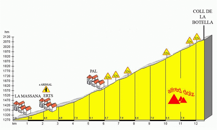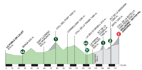 Desde esta localidad, 25 km de falso llano ascendente hasta llegar a Andorra la Vella y afrontar el tramo decisivo de la etapa, con las subidas completamente encadenadas a la Comella y Coll de la Botella. La Comella es un puerto corto pero de una dureza muy sostenida, casi siempre en torno al 8%.