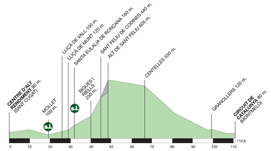 La carrera se despide con una etapa bastante llana, con el Alt de Sant Feliú como único puerto: 8 km con pendientes constantes en torno al 4-5% (aunque según el perfil oficial de la etapa parece casi el Mortirolo …). El final es cuando menos original, el circuito de Montmeló.