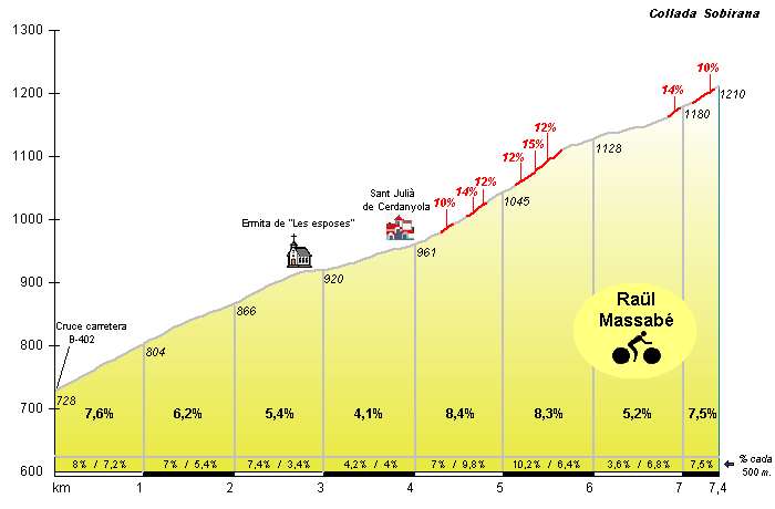 Pequeña bajada y comienzo de la larga subida hasta el Coll de la Botella. La organización ha puntuado individualmente la Massana pero como se ve en este perfil forma parte de la misma ascensión. Lo más duro son los últimos 8 km, con un 7,5 % de pendiente media y km enteros a casi el 9%.