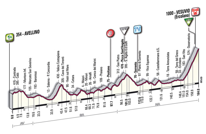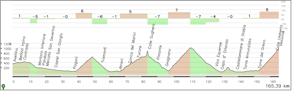 El recorrido intermedio de la etapa no tiene grandes puertos pero es muy rompepiernas, especialmente desde el km 30 hasta la localidad de Castellamare di Stabia (km 131,6), destacando las ascensiones al Valico Costapiana (7 km al 5,3%) y la larga pero irregular subida al Picco Sant Angelo. Ya en la subida al Vesubio lo más duro es un tramo intermedio de 3,5 km al 9% y la parte final, con 4,7 km al 8,7%. Especialmente exigente el kiómetro y medio final al 10%.