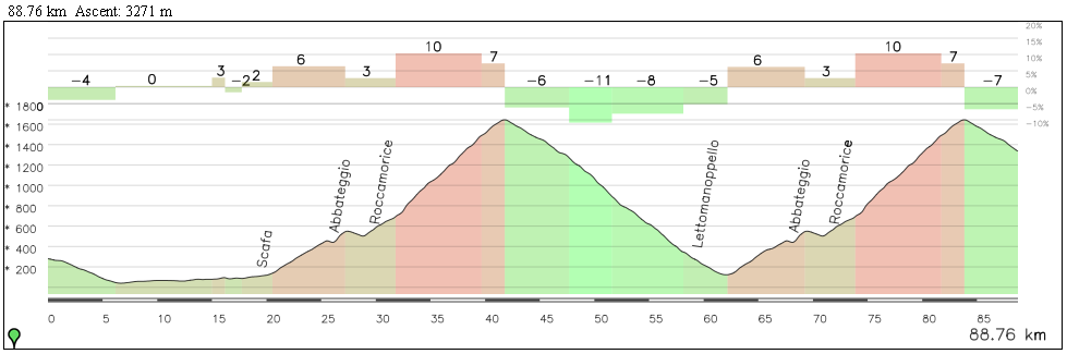 - Rapino -cruce hacia Pretoro- (km 61,4): 506 m – 7,7 km – 271 m – 3,5 % (últimos 2 km al 6,5 %)