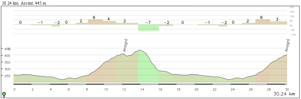 - Anagni (Meta): 401 m – 4,8 km – 174 m – 3,6 % (2,7 km finales al 4,7%)