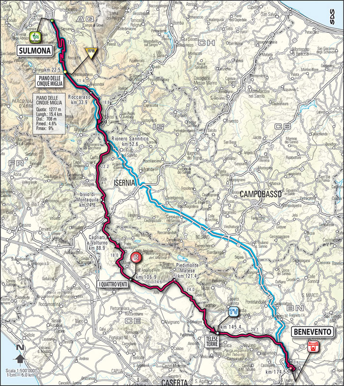 Después de varias jornadas seguidas de media o alta montaña, una etapa para que los sprinters vuelvan a tener su oportunidad (seguramente la ultima en toda la carrera). Aunque los primeros 70 km son muy propicios para las escapadas, con las subidas a Piano delle Cinque Miglia (15 km rondando el 5%) y Rionero Sannitico (por su vertiente más blanda) y sus correspondientes descensos.