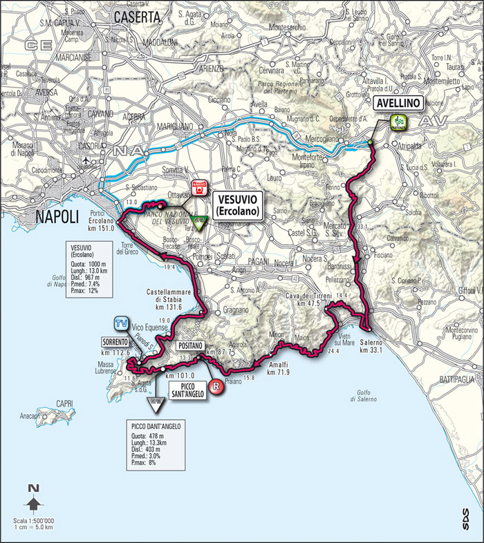 Al igual que en la etapa del Blockhaus, una opción muy interesante habría sido no terminar en alto, finalizando la etapa en Sorrento y con doble paso por el Monte Faito, por ejemplo. O terminar cerca de Nápoles después de un circuito con el Vesubio. De todos modos es comprensible el interés de la organización por terminar la etapa en el Vesubio: un final muy «mediático», tanto por la propia dureza de la ascensión como por la peculiaridad de ser un volcán … y además activo.