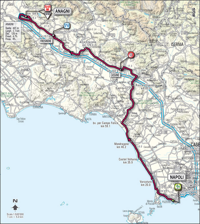 Después de la decisiva etapa del Vesubio, una jornada casi completamente llana salvo por el circuito final, que incluye dos pasos por el repecho de Anagni. En el primer paso, después de una ligera bajada, se seguirá subiendo hasta llegar a a la cota 439 m (aunque la organización del Giro lo puntuará en el primer alto). En el segundo paso estará situada la meta.