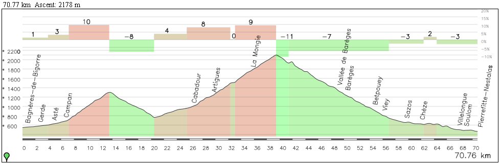 Hacer que no haya más puertos entre el Tourmalet y la llegada es una buena forma de darle protagonismo, pero no se entiende el trazado que ha preparado la organización en los últimos km, ya que en vez de finalizar directamente en Pierrefitte-Nestalas van hacia Argeles Gazost para volver después a Pierrefitte-Nestalas, dando un rodeo de unos 13 km y alejando el Tourmalet innecesariamente de meta. La jornada anterior ya pasaba por Árgeles Gazost y además no hay una meta volante, así que el paso por esa localidad en esta etapa es completamente superfluo.