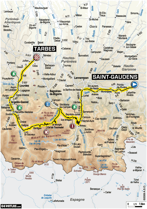 Última etapa pirenaica y previa a la jornada de descanso. Los primeros 45 km tienen poca dificultad, pero a partir de ahí se suben casi completamente seguidos dos puertos muy conocidos y de apreciable dureza (sobre todo el segundo): Col de Aspin y Col du Tourmalet.