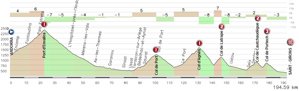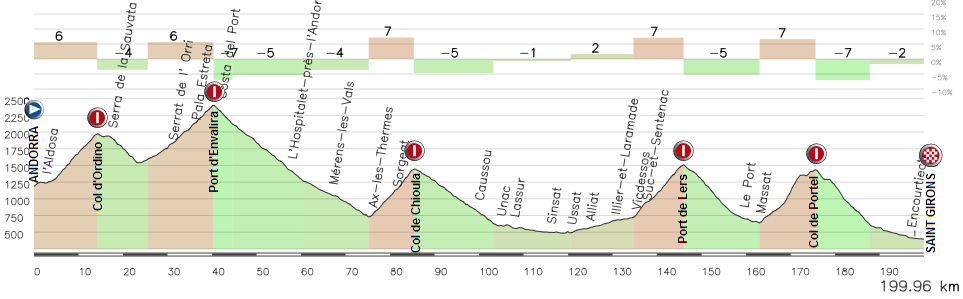 Las opciones llegando a Saint Girons son muchas. En en análisis de la etapa se mostró la forma de enlazar Col de Port con la zona durísima del Col de Portel, y en esta sugerimos incluir más desgaste anterior (Col d’Ordino). Así, tendríamos dos partes diferenciadas en la etapa, con tres puertos de 1ª al principio de mucho desgaste y donde se formaría seguro una fuga de corredores de mucho nivel preparando las estrategias de equipo, y una parte final con los dos puertos clave: Port de Lers (un desvío cerca de la cima del Col d’Agnés) y Col de Portel entero. La primera parte de este último puerto es solo un calentamiento para su brutal final, con ¡4km al 11,5%! Otro punto importante sería la bajada, técnica y difícil, que se realiza por la misma carretera que usó el año pasado el Tour para ascender este puerto, aunque también existe otra posible carretera por la que bajar, la vertiente NW del puerto que baja a Rimont, aunque es algo menos directa.