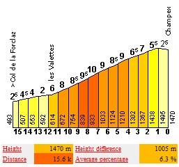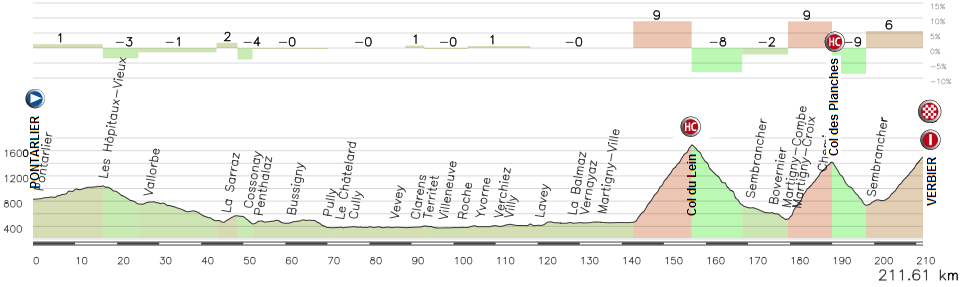 Sin duda una de las etapas que más necesita la mejora, y que más fácil es de mejorar, pues cerquísima de Verbier se encuentran tres grandes puertos como Lein, Planches o Champex que se enlazan muy bien con el final en alto, especialmente los dos primeros. Si solo se incluyera un puerto, el más adecuado seria el Col du Lein pues es el más duro y no deja apenas llano hasta el comienzo de Verbier, pero se puede «rizar el rizo» y poner dos Hors Categorie de paso para plantear un etapón.