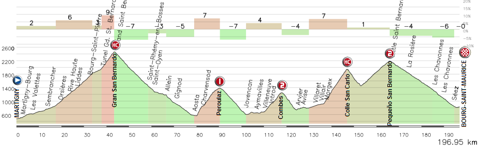 Lo bueno del recorrido del Tour es que no tiene muchos finales en alto: solo 3, y dos de ellos (Arcalís y Verbier) no muy duros, por lo que no deberían condicionar la carrera en exceso y los escaladores se pueden ver necesitados de recuperar tiempo en otras etapas. Por eso, las etapas que aquí proponemos podrían ser lo que un escalador necesitase para darle la vuelta a la tortilla de la clasificación general (una pena que no haya mas CRI para acentuar la necesidad de los escaladores), pues las del Tour son demasiado «descafeinadas» para ello.