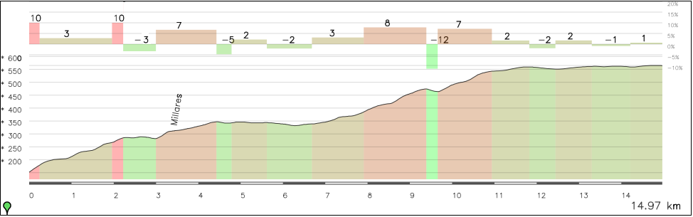 La parte central de la etapa es un auténtico rompiernas, con los puertos de La Muela y Millares además de varios repechos, y todo ello por carreteras estrechas y plagadas de curvas.