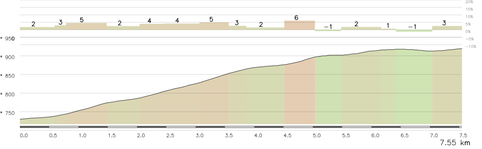 Pasados 2 duros repechos, empieza el descenso real aunque enseguida se afronta una nueva subida de casi 3 km (rondando el 4%), seguida de un tramo de falso llano ascendente.