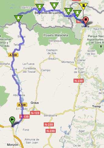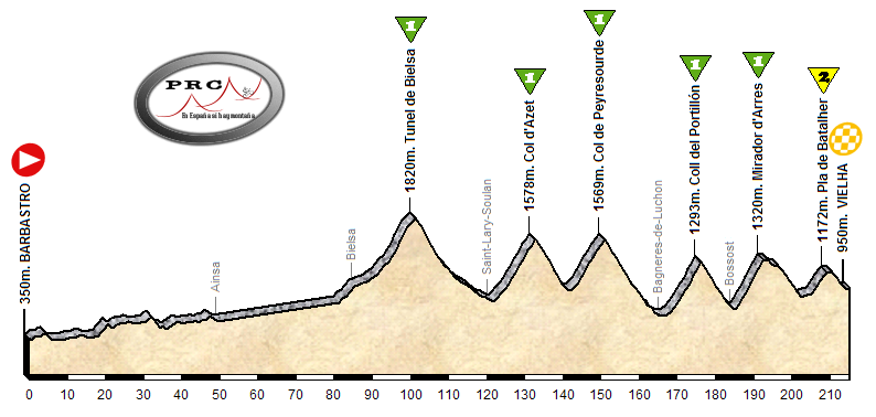Con un pequeño paso por Francia se puede diseñar este autentico etapón: 215 km. y 6000 m. de desnivel acumulado (estos datos se puede suavizar saliendo desde Ainsa, en el km. 50). Y todo ello pese a no pasar por ningún gran puerto, pero la continuidad de las 6 ascensiones incluídas en la etapa (5 de 1ª) hacen que esta finalice con 130 km de autentica «montaña rusa», sin parar de subir y bajar.
