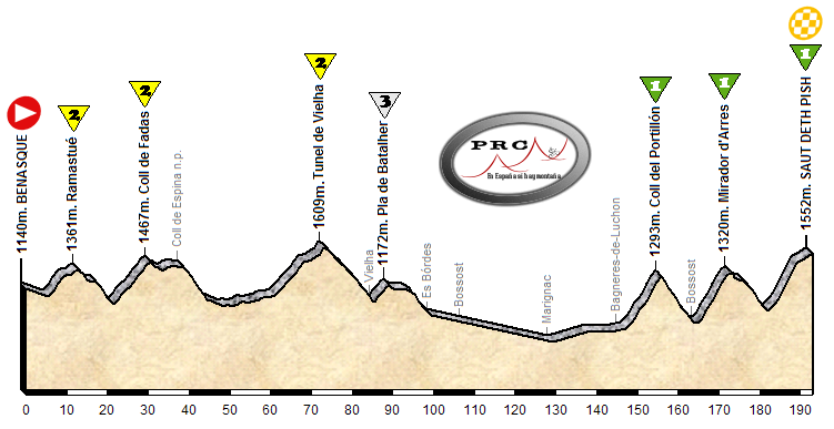Desde Benasque se suelen iniciar las etapas siguientes a una llegada en Cerler, y la usamos en este caso como inicio de una etapa muy dura , con 4000 m. de desnivel y tres partes claramente diferenciadas. De salida, se afronta la subida a Ramastué (muy interesante, sobre todo, para hacerla en sentido contrario antes del final en Cerler), se sigue por el Coll de Fadas y se entra en el Vall d’Aran por el Tunel de Vielha, todos ellos de 2ª categoría. Desde ahí, se sube Pla de Batalher por la vertiente contraria al resto de etapas antes de afrontar unos 50 km de llano, un respiro para los ciclistas antes del exigente final. Los últimos 45 km cuentan con nada menos que 3 puertos de primera, todos ellos con zonas muy duras propicias para romper la carrera en pedazos.