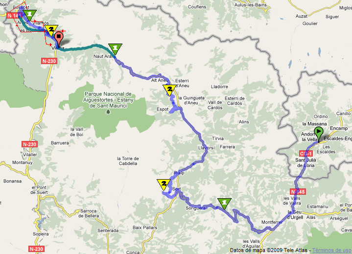 También mostramos en este caso como quedaría la parte final alargándola hasta Pla de Beret, algo que mejora sustancialmente los recorridos de otras ediciones, pero que de todos modos aleja los puertos de paso respecto al final en Vielha, con un tramo de falso llano ascendente que podría «asustar» a aquellos que piensen en atacar, si bien el desgaste acumulado se haría notar.
