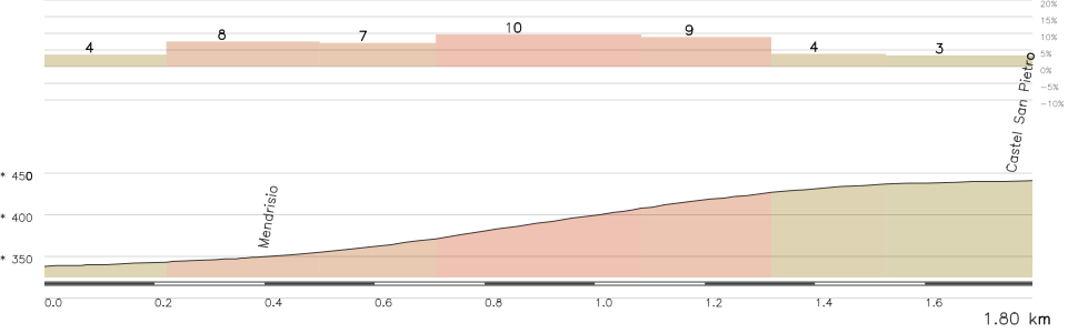 - L´Aqua Fresca/Castel San Pietro (km 4,1): 439 m – 1,6 km – 119 m – 7,4 %