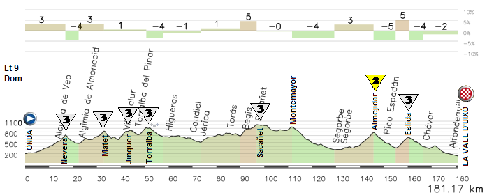 Media montaña pura, sin apenas descanso en todo el trazado. No hay grandes porcentajes en los puertos, pero son muchos y muy seguidos, con Almedijar y Eslida cerca de meta, de manera que sería muy difícil de controlar por parte del pelotón. Escapada con éxito casi asegurada, y dependiendo de quien entre en ella podría tener alguna incidencia en la general. Además al día siguiente va el descanso por lo que habrá más corredores con ganas de arriesgarse.