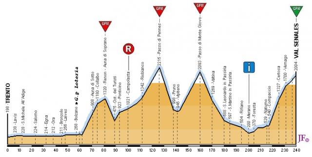 11. Seria una etapa durísima, pero creemos que no es factible en profesionales ya que el Pico Chiadin no está asfaltado. Y la pendiente es demasiado fuerte como para pasarlo al estilo Finestre.