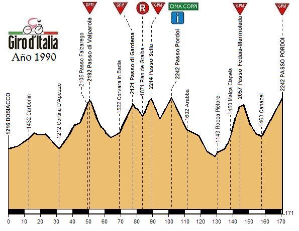 Año 1990, con Valparola, Gardena, Sella (km 5), Pordoi (km 6,5), Fedaia y Pordoi