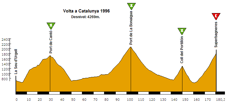 Y por último queremos dejar la etapa reina de la Volta de 1996, una etapa muy dura con tres Primeras y un final de Categoría Especial, con mucho llano entre los primeros puertos pero con un buen encadenado final. Sirva de muestra de que siempre se han hecho etapas muy duras en La Volta y que no se debe renunciar a ellas pues han sido parte de su historia, y el resto de carreras de una semana podrían hacer lo mismo.