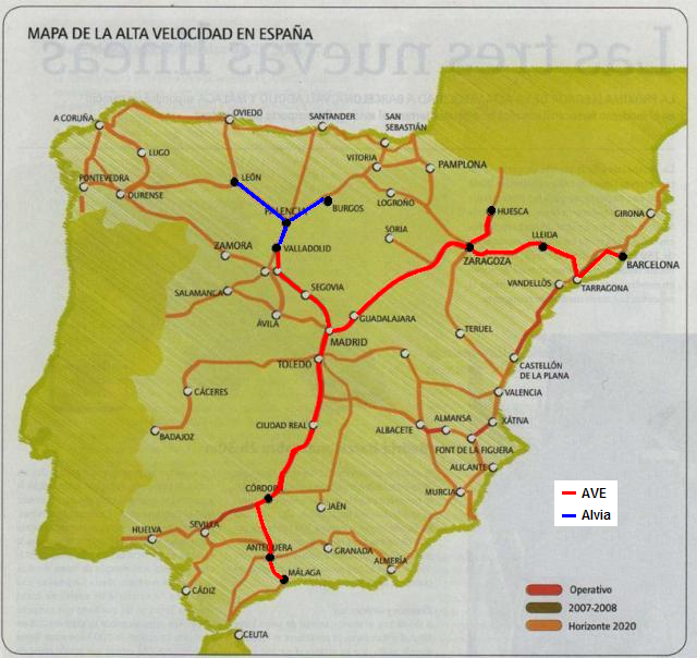 Mapa de la red de alta velocidad proyectada para 2020 sobre el que se han marcado las lineas y ciudades usadas para las entradas del blog y su tipo de servicio actual