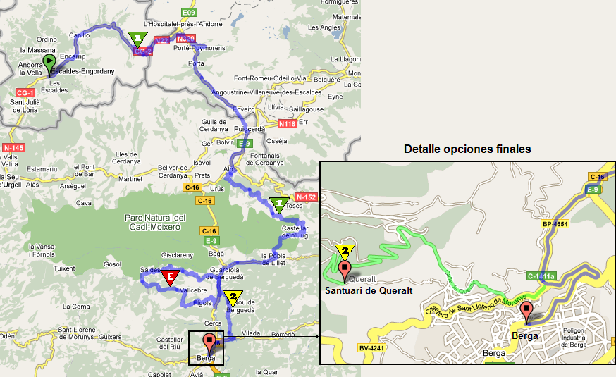 La bajada termina a unos 8 Km. de Berga, donde en principio se situaría la meta, siendo tres de ellos de ascensión al 5% de media. Y si se quiere endurecer aun más la etapa, se puede terminar en el Santuari de Queralt, 6,5 Km. al 7,4%. Hay que comentar que si bien ambos serían finales inéditos en La Vuelta, la zona ya ha sido visitada cuando la carrera terminaba en la estación de esquí de Rasos de Peguera (actualmente clausurada, por eso no se incluye como final de etapa en ningún perfil, pero sería simplemente seguir subiendo hasta los 1892 m. pues comparte inicio con el Santuari de Queralt).