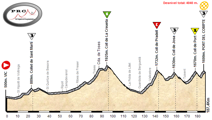 Con el fin de buscar la viabilidad económica de las etapas, la llegada la situamos en Port del Compte, la tercera estación de esquí tras la pequeña de Coll de Pal y la conocidísima de La Molina. La etapa en sí tiene tres partes claramente diferenciadas. Una primera zona más fácil para formar escapadas, donde solo se sube el Collet de Sant Martí  (y el  falso llano posterior hasta el Collet de Sant Agustí) antes de un largo tramo llano que nos lleva hasta Ribes de Fesser. Aquí comienza la segunda parte, con dos puertos de paso de entidad. El primero es el Coll de la Creueta, pero ascendiendo por la inédita vertiente que atraviesa el pueblo de Toses, lo cual endurece la subida porque entre este pueblo y la collada del mismo nombre hay 4,4 Km. al 8,7%, con largos tramos sostenidos por encima del 10%. Y tras este «calentamiento» llega Pradell por Vallcebre, siendo el tramo final de este puerto el mejor lugar para atacar de toda la jornada. De su cima hay 45 Km. hasta la meta, pero no dan respiro pues habrá que subir dos terceras y un segunda, de nuevo un terreno precioso para ver persecuciones si antes ha habido ambición por parte de los ciclistas.
