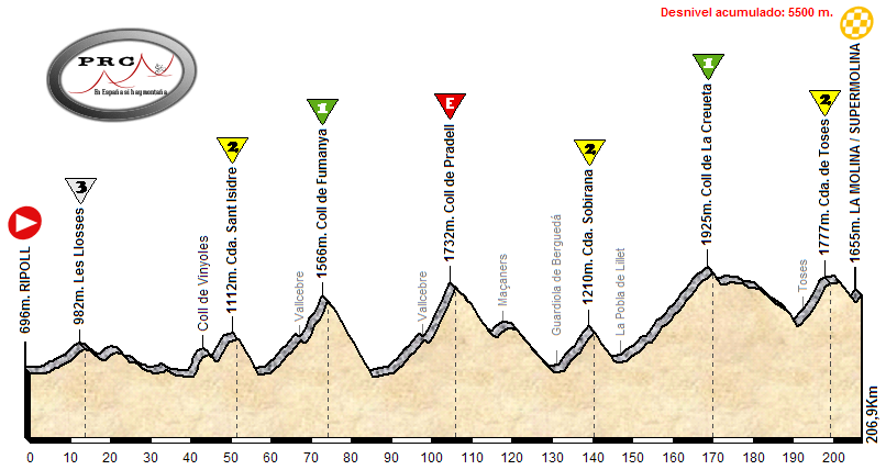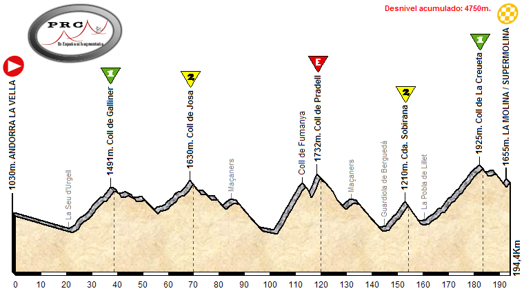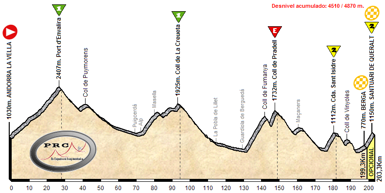 Esta  etapa se inicia en un clásico del ciclismo como es Andorra, y ya desde el primer Km. hay que empezar a subir los 1370m. de desnivel del Port d’Envalira para coronar por encima de los 2400m. de altitud. Una eterna y tendida bajada atravesando Francia por unos kilómetros, incluyendo el repecho de Puymorens, nos lleva a Puigcerdá y Alp para ascender entonces al Col de la Creueta por la carretera de La Masella, un puerto con un inicio duro y una parte final donde se crestea alternando subidas y bajadas. De nuevo otra larga bajada, en este caso más técnica, nos lleva al inicio del punto clave de la jornada donde se debe romper la carrera, Pradell por Fumanya. Otra bajada más con un repecho no puntuable, el de Maçaners, nos lleva a afrontar sin respiro las fuertes rampas de la Collada de Sant Isidre. Pero las complicaciones siguen, en este caso con un descenso complicado con tramos de fuerte pendiente, en especial pasado el repecho del Coll de Vinyoles.