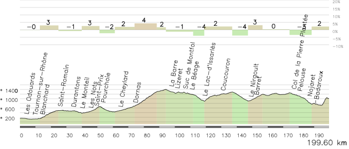 Perfil aproximado de la etapa Bourg de Peage-Mende. *Faltan los 10 km iniciales, completamente llanos.