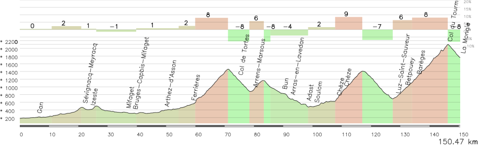 Lo más duro de la etapa son los primeros 70 km, con las subidas encadenadas al Peyresourde (justo de salida), Aspin y Tourmalet, todos ellos por su vertiente más exigente (salvo quizás en el caso del Tourmalet, donde las 2 vertientes tienen una dureza similar).