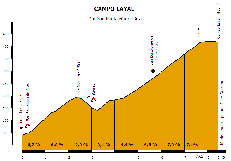 Si la meta se quiere situar en Laredo, tras bajar Campo Layal, se puede girar en Ampuero hacia el norte para encarar la subida a La Seña por la vertiente contraria y finalizar en Laredo justo después de su bajada y un pequeño repecho. Este es el perfil de dicho final (con Campo Layal de inicio).