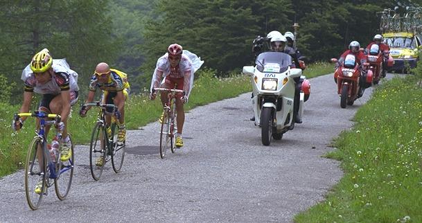 Se aprecia perfectamente en esta imagen del descenso del Colle della Fauniera, que la carretera no tenía un asfalto perfecto y de ancho apenas cabe poco más de un coche. Y es que escuchando a veces a algunos corredores, directores, periodistas e incluso organizadores o aficionados, parece que lo que no sean descensos inmaculados ni tienen ni han tenido cabida en el ciclismo. Y eso no es verdad, cosa que demuestran los muchos descensos como este y similares que se ven en el Giro, o en otras carreras como el Tour o la Vuelta al País Vasco.