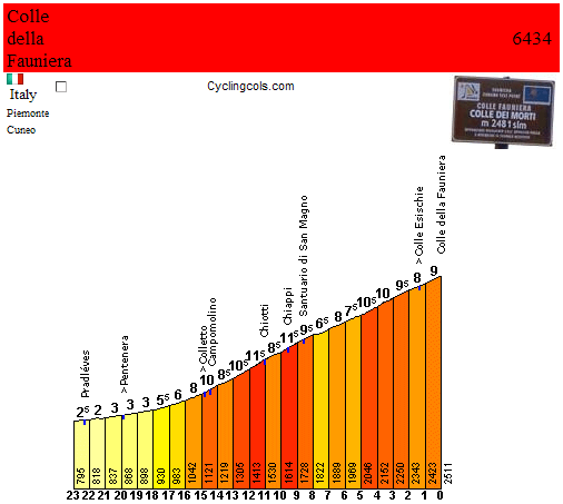 Cabe también comentar que la etapa suponía el estreno de un coloso como la Fauniera, uno de los puertos más duros que se han subido jamás en el Giro. Y se estrenaba con su cima a 60 Km. de meta y con un primera como Madonna del Colletto a continuación. Y como era de esperar, semejante coloso rompió totalmente la carrera y las diferencias en meta fueron muy grandes, dándonos los ciclistas un gran espectáculo durante casi dos horas. La única pega a la etapa es que sobraba el circuito final de 7 Km. por Borgo San Dalmazzo, pero no tuvo apenas influencia en el desarrollo de la etapa.
