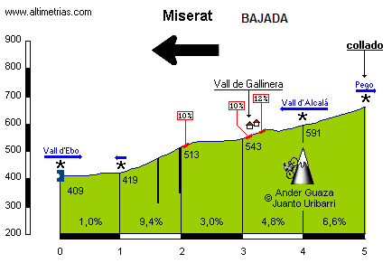 Como se ve en el perfil, desde el Collado del Miserat se puede seguir ascendiendo durante 1,1 Km. muy duros, pero no creemos viable colocar allí un final por la falta total de espacio. Además, preferiríamos un final tras bajada, que puede resultar mucho más espectacular que un final en alto (como ejemplo, Le Grand Bornand 09, que fue la mejor etapa del Tour) y al menos es algo diferente, porque llegadas duras se ven muchas a lo largo de la temporada y precisamente La Vuelta suele carecer de jornadas selectivas cuyo puerto decisivo no sea la meta.