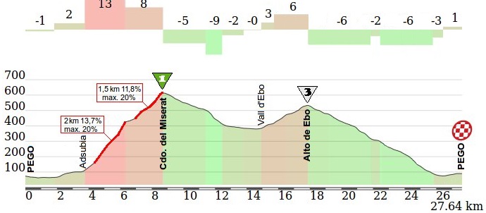 La meta hemos decidido situarla en el mismo Pego, ya que desde la cima del Miserat no hay momento de respiro: tras la bajada a Vall d’Ebo se asciende el Alto de Ebo, que da continuidad a la dureza, y el descenso  final es bastante técnico (pero nada peligroso, aquí podéis ver un impresionante video de la bajada) por lo que el control de la carrera sería muy complicado en los 18 Km. que faltarían a meta tras coronar el puerto de 1ª, y los más fuertes en el Miserat seguramente mantendrían su ventaja hasta meta. Este sería el perfil detallado del circuito: