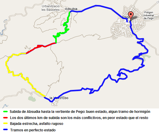 Mapa del recorrido, marcando el estado del asfalto