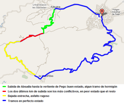 En cuanto a la viabilidad del circuito, tan solo pudiera suponer un problema el tramo marcado en rojo en el mapa, pero es corto (solo 2 Km.) y en subida, con lo que parcheando los baches que pudieran existir no habría problema alguno.