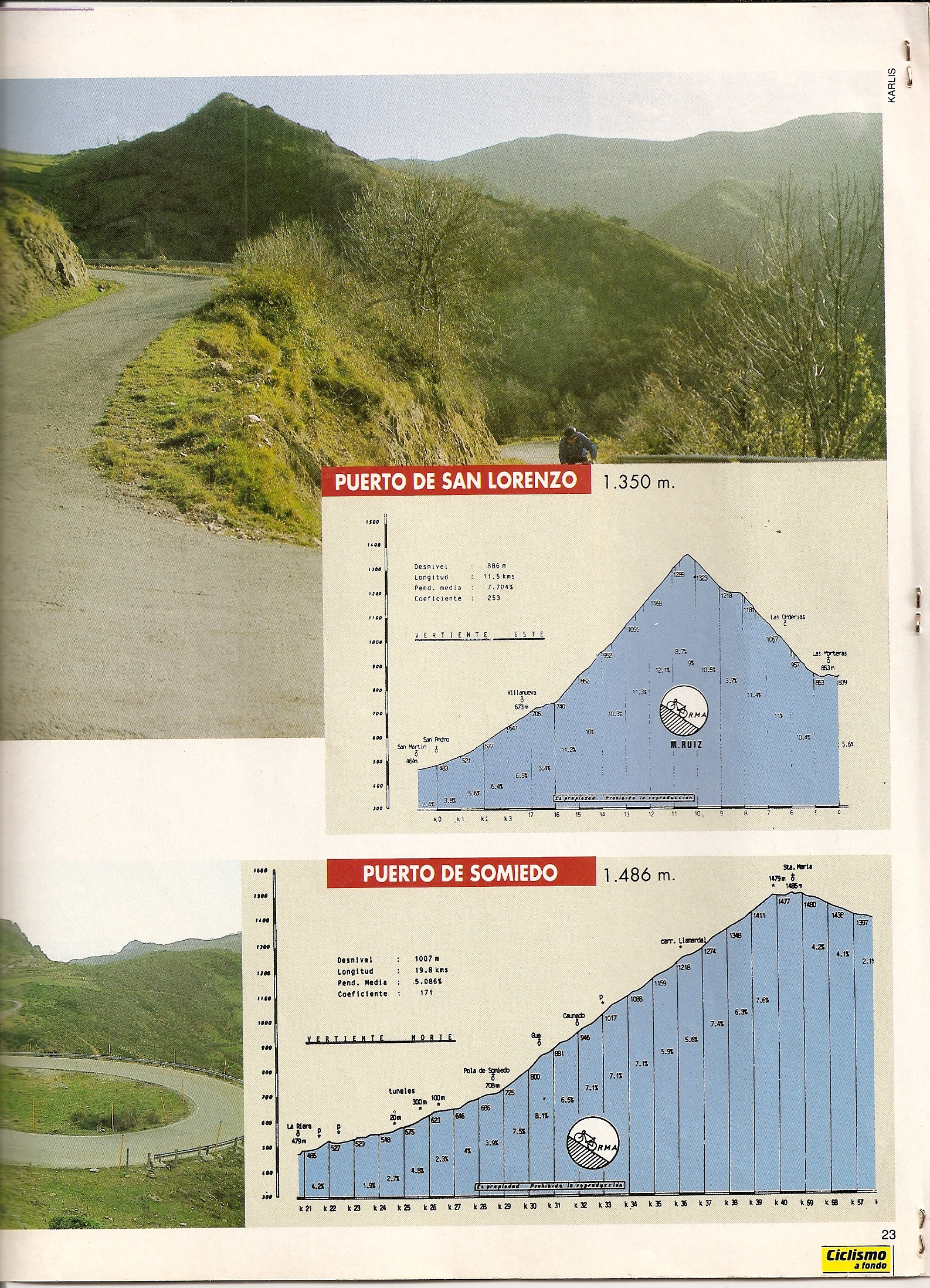 3. Esta claro que hay muchos sitios en España para hacer etapas «de verdad» de montaña, pero creo que Asturias se lleva la palma. Su especial configuración orográfica obliga ha tejer una red de puertos que unan los valles que discurren desde la cordillera. Eso unido ha la infinidad de puertos que dan paso a la meseta, confiere esta comunidad como la comunidad con mas puertos de montaña por kilometro cuadrado de superficie. Esa etapa de la que hablais por ejemplo, acabando en Somiedo es una de ellas. Pero tambien hay otras, y entre ellas destacan las del concejo de lena, con tres puertos fuera de categoría. Uno es el ya conocido Pajares, otro, aún por descubrir, es el alto de la Cubilla, un puerto tipo tour, largo y con pendientes duras alternadas con algún descanso. Pero sin duda, el gran desconocido es el puerto que da acceso al repetidor de tv central de Asturias, que se ubica en el pico Gamoniteiro. Solo os dejaré un par de datos: son mas o menos 15 kilómetros de longitud con un desnivel de unos 1450 metros, rampas del 18-20 % y ni un solo descanso. Es un coloso de dimensiones muy superiore a cualquier puerto de España y ademas adornado con unas vistas simplemente espectaculares. En la actualidad tiene un tramo de unos 3-4 km con el piso en mal estado, pero la inversión en la carretera sería mínima y amortizable en un tiempo mínimo. Lacima se encuentra a pocos Km del Angliru, de hecho son dos accesos al puerto ganadero del Aramo, pero al contrario que este, no tiene rampas imposibles del 25 %, que para mi no aumentan el especttaculo, si no que lo reducen.