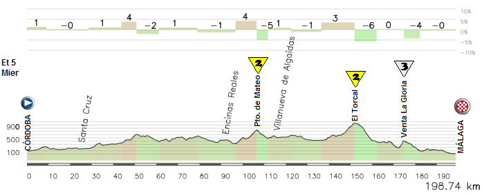 Media montaña no demasiado exigente y algo lejos de meta. Primero se suben el Pto. Mateo y el Alto del Torcal (hasta km 12). Lo más peligroso es la subida a la Venta de la Gloria (hasta cruce Málaga) pues es cortita pero con porcentajes muy altos y alguien puede lanzar un demarraje fuerte allí. Es fácil que haya una escapada consentida, máxime teniendo en cuenta que al día siguiente llega la alta montaña.