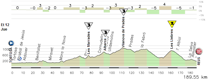Etapa llana y cerca de la costa en su primer tercio, y media montaña pura en el resto, con varios terceras consecutivos seguidos de un buen segunda, el Coll de les Llebres, cuya cima estaría a unos 25 kilómetros de meta. Sería un día propicio para escapadas, justo después de la primera crono individual.