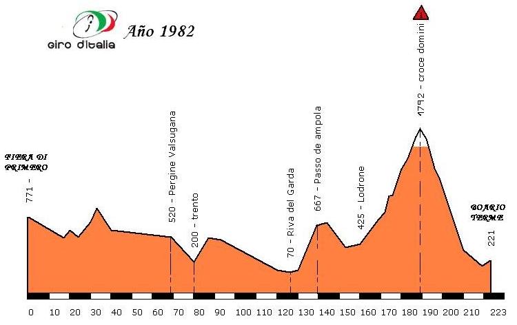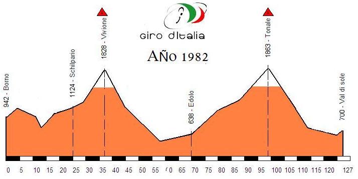 Sólo 130km de etapa, con las vertientes menos duras de Vivione y Tonale en el camino, al paso por los Alpes del Giro ‘82.